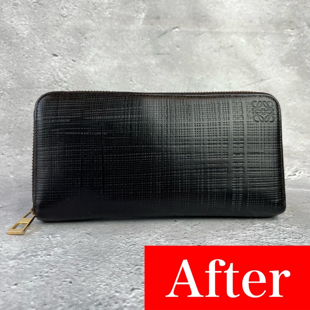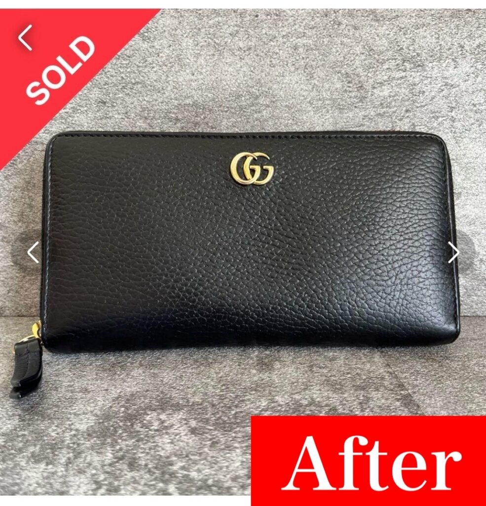 GUCCIのラウンドファスナー長財布です。こちらも過剰な汚れダメージはなく、ブラックリカラーを施して利益が生まれました。基本的にラウンドファスナーの財布は内部が綺麗な状態が多いので外側だけのリカラーで終了します。
